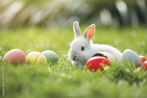 Adorable Bunny With Easter Eggs In Flowery Meadow