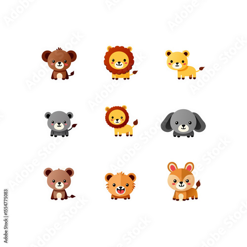 Adorable cartoon animal sticker set featuring a bear, lion, dog and deer in colorful vector illustration on a black background