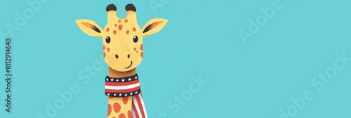 Adorable cartoon giraffe on a blue background wearing an American flag scarf.