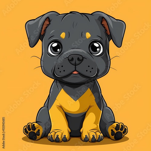 Adorable cartoon puppy sitting against a bright orange background.