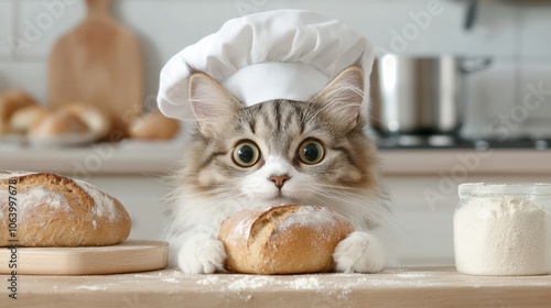Adorable cat in chef hat with freshly baked bread in kitchen setting