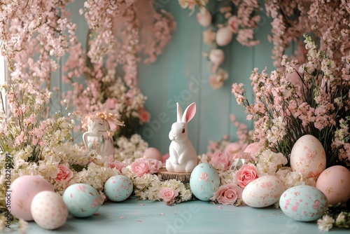 Adorable Easter Bunny with Speckled Eggs and Flowers on Blue Wooden Table in Soft Spring Setting