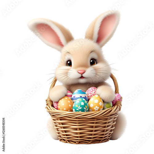 Adorable fluffy easter bunny holding a wicker basket full of colorful eggs isolated on transparent background