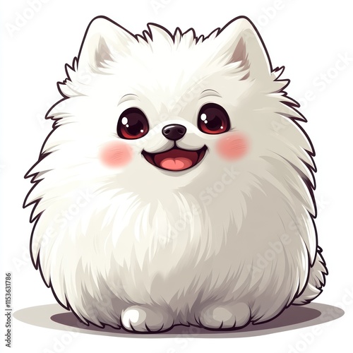 Adorable fluffy white puppy with rosy cheeks, sitting.