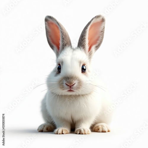 Adorable fluffy white rabbit sits isolated on transparent background. Cute pet with fur, whiskers, paws. Mammal wildlife animal. Easter bunny. Domestic rodent, studio shot of young hare, baby rabbit.