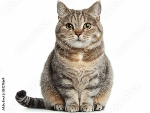 Adorable Gray Tabby Cat Sitting Calmly on White Background with Curled Tail Domestic Feline Pet Portrait in Studio with Soft Fluffy Fur and Attentive Expression
