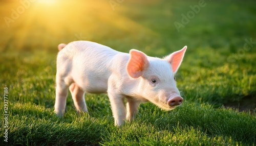 Adorable Newborn Piglet Strolling on a Lush Green Lawn amidst the Soft Sunlight of a Summer Morning, Radiating Joy and Innocence.