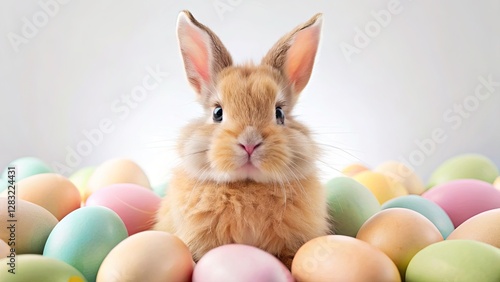 Adorable pastel Easter bunny surrounded by vibrant eggs; a cute spring photo.