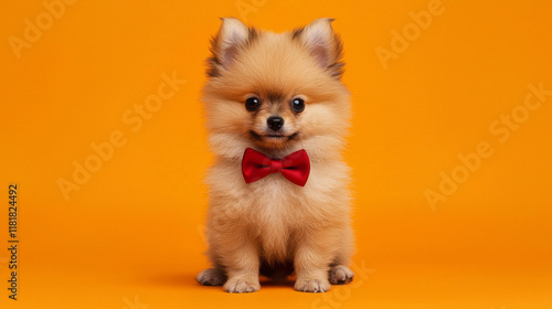 Adorable Pomeranian Puppy Wearing a Red Bow Tie on Orange Background