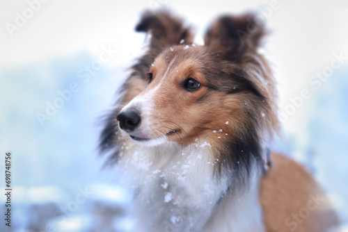 Adorable puppy of shetland sheepdog also known as sheltie enjoying first snow.