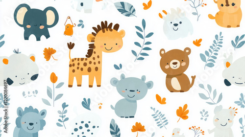 adorable seamless cartoon animal print for kids nursery fabric with cute pastel safari animals including giraffe, elephant, lion, and bear illustrations ideal for decor and gifts