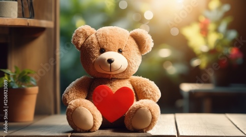 Adorable Teddy Bear Holding a Red Heart on a Wooden Table Surrounded by Greenery and Soft Lighting for Valentine's Day Celebration