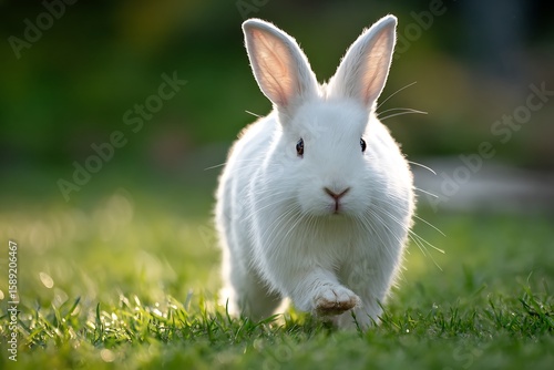 Adorable white rabbit in a lush green meadow bathed in sunlight