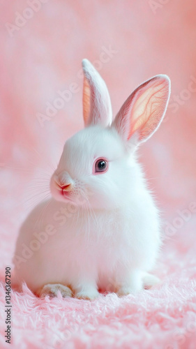Adorable white rabbit with large ears sitting on a pastel pink background, soft-focus lighting, dreamy atmosphere, perfect Easter postcard