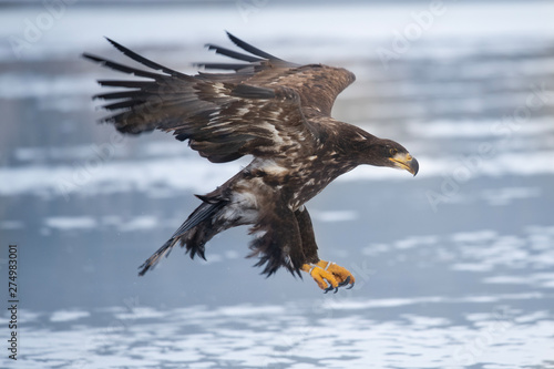Adult White-tailed eagle in flight. Blue sky background. Scientific name: Haliaeetus albicilla, also known as the ern, erne, gray eagle, Eurasian sea eagle and white-tailed sea-eagle.