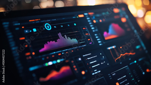 Advanced data analysis dashboard displaying financial metrics and trends during nighttime in a modern office setting