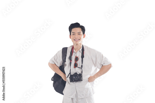 Adventurous Explorer: A cheerful traveler, camera at the ready, poised for discovery with backpack and stylish camera, a symbol of wanderlust and capturing unforgettable experiences.