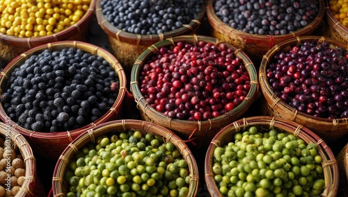 Advertisement photo of colorful coffee beans in wooden baskets arranged on display at an Asian market, with yellow and red seeds next to green beans.