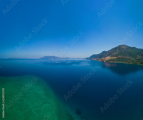 Aerial drone bird's eye view photo of tourists snorkeling above old Sunken City of Epidauros, Greece