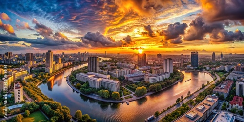 Aerial Landscape Photography of a Vibrant Cityscape at Sunset with Dramatic Clouds and Reflective Water Surfaces
