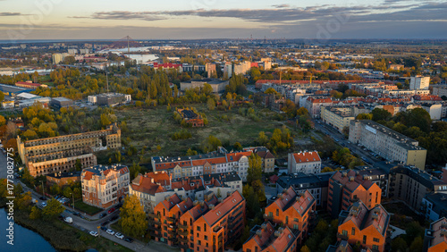 Aerial late afternoon view of Gdansk Old Town and Motlawa River