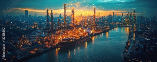 Aerial panoramic view of an illuminated modern cityscape reflecting on the waterfront at sunset The image showcases the bustling urban development advanced infrastructure