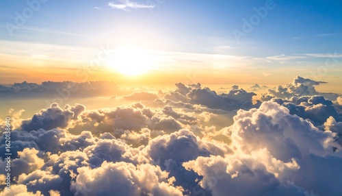 Aerial perspective of a breathtaking sunset above clouds, blue sky, and golden sunlight
