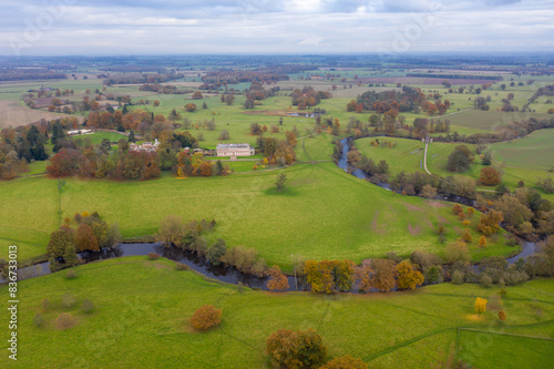 Aerial photo of the British village of Little Ribston which is a civil parish in the Harrogate district of North Yorkshire in Leeds showing the typical country side on a cold day in the Autumn