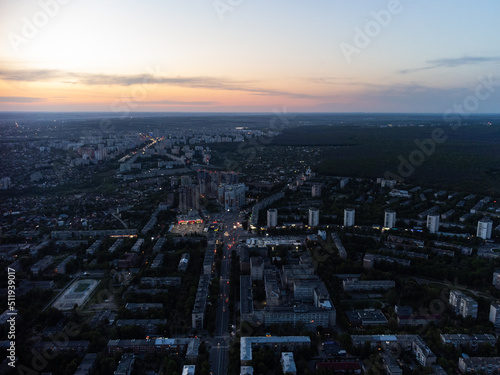 Aerial sunset evening view on residential Kharkiv city Pavlove Pole district streets with lights. Gray multistory buildings with scenic vivid sunset cloudy sky