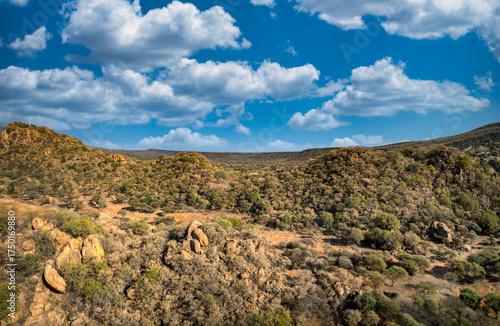 aerial view, African landscape hills in Botswana , rocky terrain and acacia trees