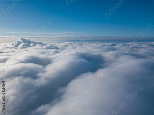 Aerial view. Flying over white clouds during the day in sunny weather.