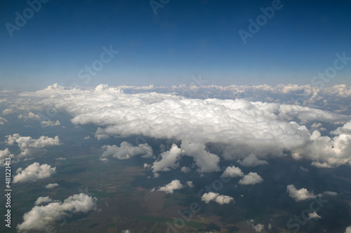 Aerial view from airplane window of white puffy clouds on bright sunny day