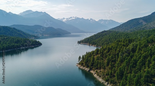 Aerial view Mountain lake, forest, serene landscape, summer day, travel brochure
