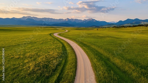 Aerial view of a dirt road meandering through a vast green meadow filled with patches of yellow flowers, leading towards distant mountains.