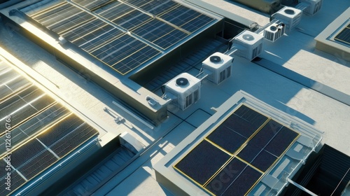Aerial view of a roof with solar panels and air conditioning units on a building