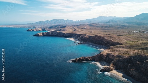 Aerial view of a rugged coastline with turquoise water meeting brown, arid hills and mountains under a bright blue sky