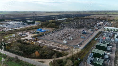 Aerial view of a sprawling electrical substation under construction amidst fields, contrasting grey metal against the earthy tones, Sutton Bridge, United Kingdom.