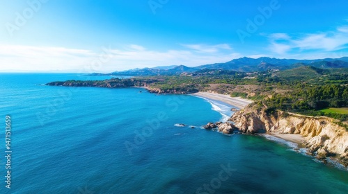 Aerial view of a stunning coastline with a secluded beach, turquoise water, and verdant hills under a clear blue sky. The landscape showcases a dramatic contrast between the rugged cli : Generative AI