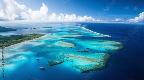 Aerial view of a vast ocean with small islands scattered, showcasing turquoise waters and coral reefs.