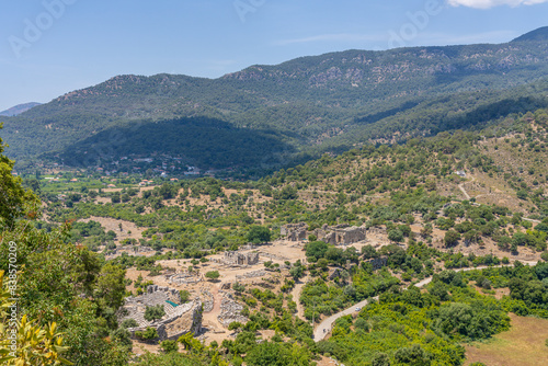 Aerial View of Ancient Kaunos Ruins from Acropolis, Turkey - Lush Green Valleys and Historical Landmarks