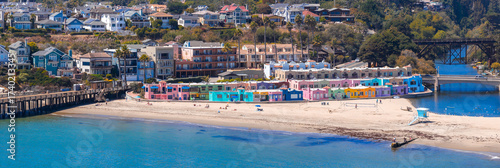 Aerial view of Capitola Beach in California, featuring pastel Venetian cottages, a wooden pier, a bridge over an inlet, and the Pacific Ocean.