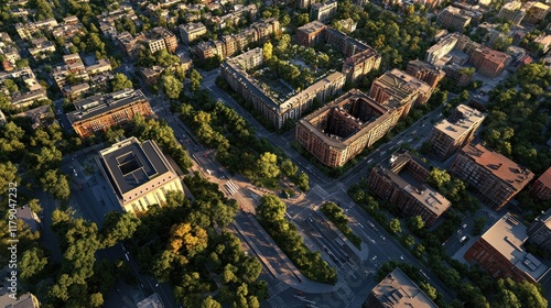Aerial view of city streets, buildings, and green spaces at sunset.