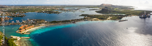 Aerial view of coast of Curaçao in the Caribbean Sea with turquoise water, cliff, beach and beautiful coral reef over Caracas Bay