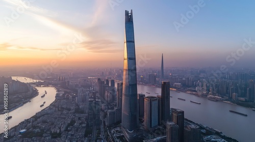 Aerial view of modern skyscrapers along a river at sunset in an urban landscape.