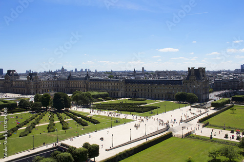 Aerial view of people enjoying sunny weather at Jardin Des Tuileries in Paris. Expansive, 17th-century formal garden dotted with statues, including 18 bronzes by Maillol.