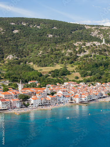Aerial view of the sun-kissed shore where the turquoise sea meets the red-roofed houses nestled against the verdant hills, Baska, Primorje-Gorski Kotar County, Croatia.