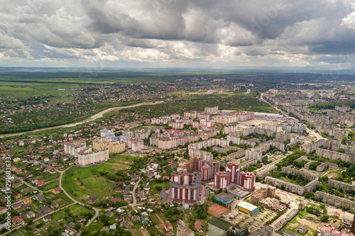 Aerial view of town or city with rows of buildings and curvy streets in summer. Urban landscape from above.