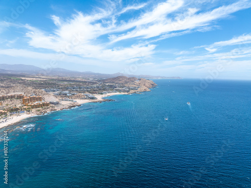 Aerial view of tropical beach with resorts in Cabo San Jose, Baja California Sur, Mexico