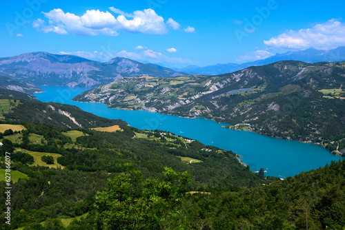 Aerial view on blue Lake of Serre-Poncon, reservoir border between Hautes-Alpes and Alpes-de-Haute Provence departments, one of largest in Western Europe
