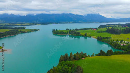 Aerial view over Lake Forggensee at the city of Fuessen in Bavaria Germany